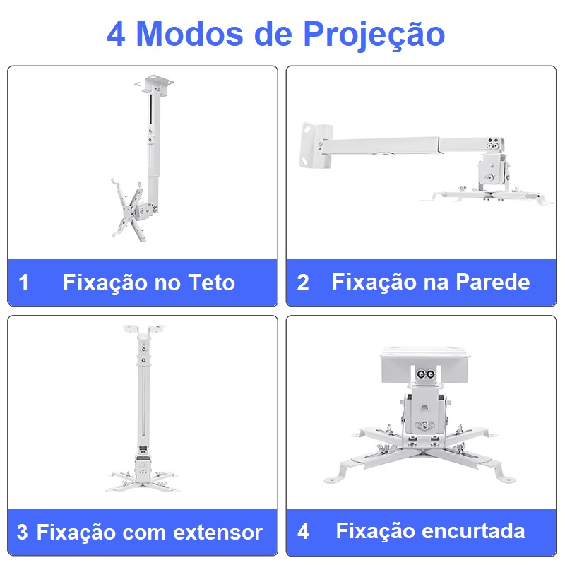 Suporte com 4 modos de uso… Fixação no teto, Fixação na parede, Fixação com extensor e Fixação encurtada