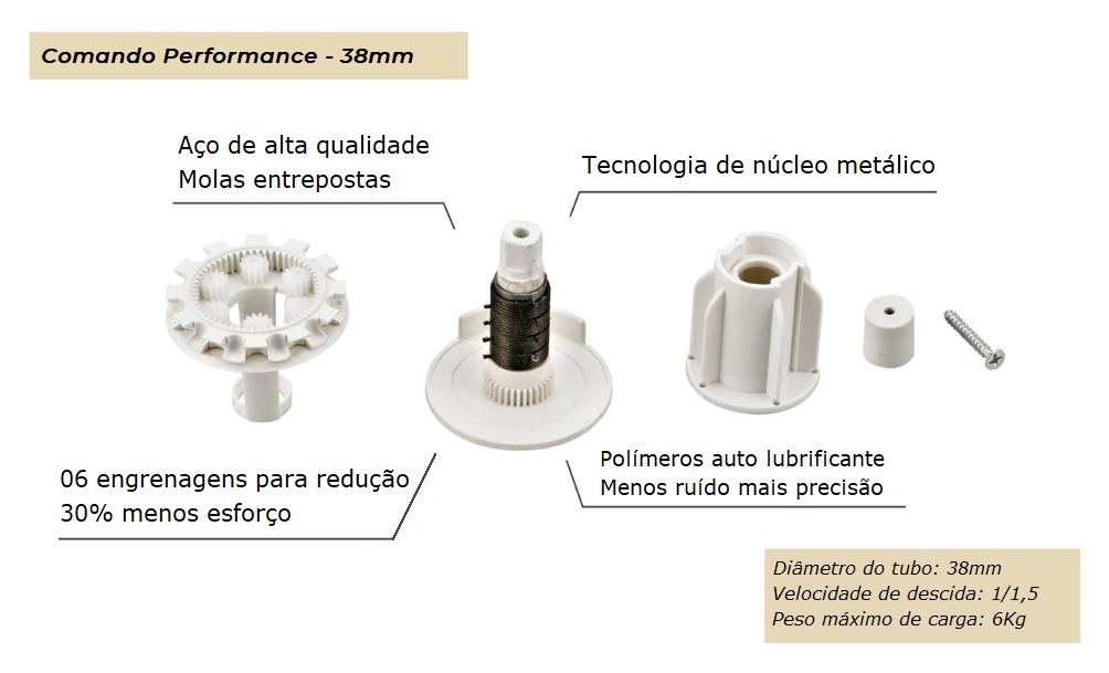 O Comando para persiana 38mm Linha Performance da Nardelli foi especialmente desenvolvido para atender os mais altos padrões de qualidade e exigências do mercado Premium de persianas. Esse produto garante um uso silencioso e precisão nos ajustes, com um exclusivo sistema de redução de peso de 6 engrenagens, possibilita leveza e praticidade no manuseio.